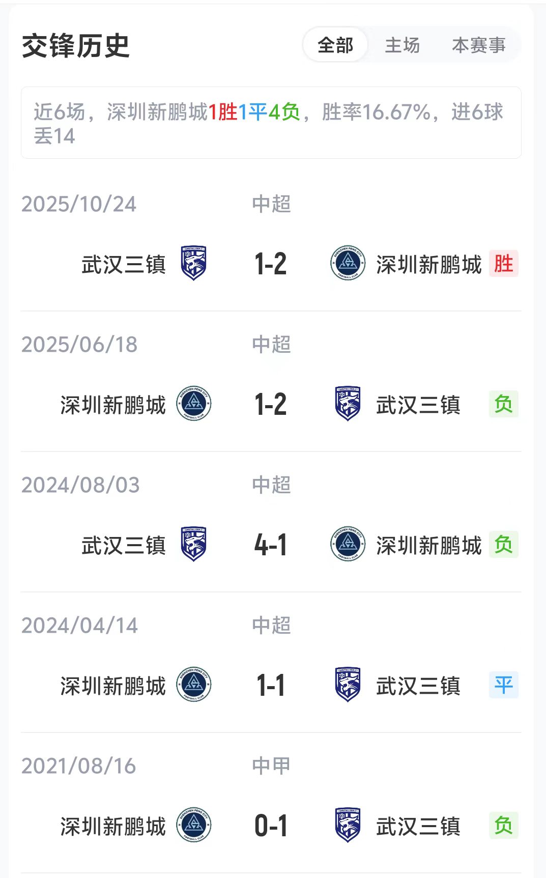 现在,深圳新鹏城1胜2负积3分名次联赛第6,武汉三镇1胜1平1负积-1分名次联赛第12。