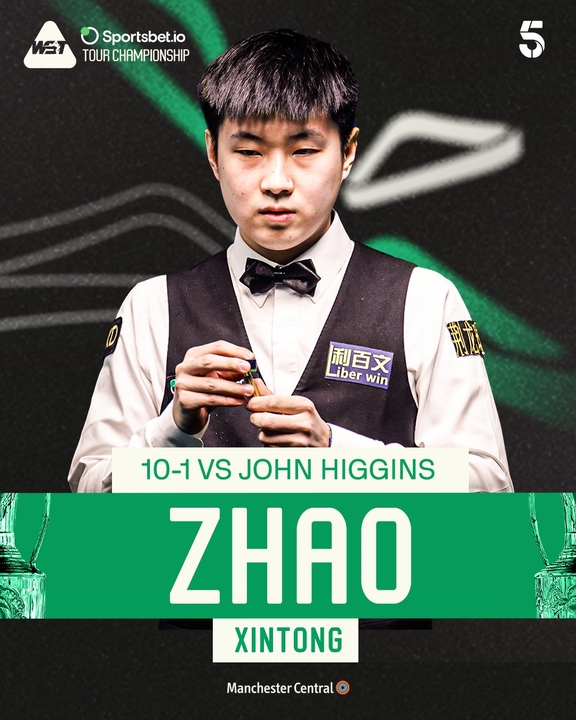 第一阶段当时赵心童8-0当先约翰·希金斯,第二阶段上半场赵心童再胜一局首先抵达赛点,希金斯补救赛点,第十一局赵心童打出单杆50+锁定胜局!