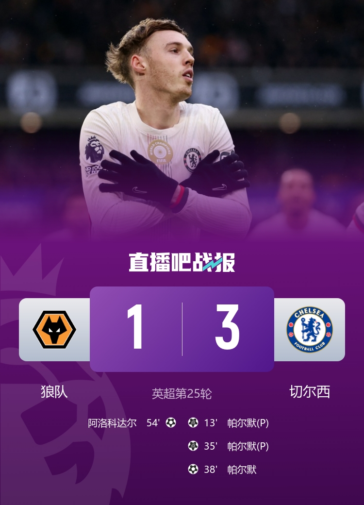 上半场伤停补时5分钟,半场停止,切尔西暂3-0狼队。上半场若昂·佩德罗两次造点,帕尔默点射双响,随后帕尔默接库库雷利亚助攻再下一城,切尔西暂3-0狼队;下半场阿洛科达尔扳回一球,安德烈·桑托斯伤退,终极切尔西3-1战败狼队,联赛四连胜,距前四1分,狼队继承垫底。↓