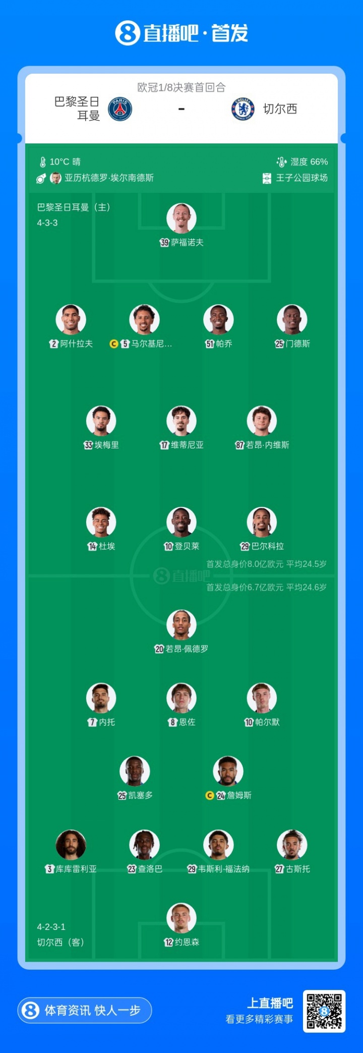 巴黎vs切尔西首发:登贝莱pk帕尔默,维蒂尼亚、凯塞多、恩佐出战